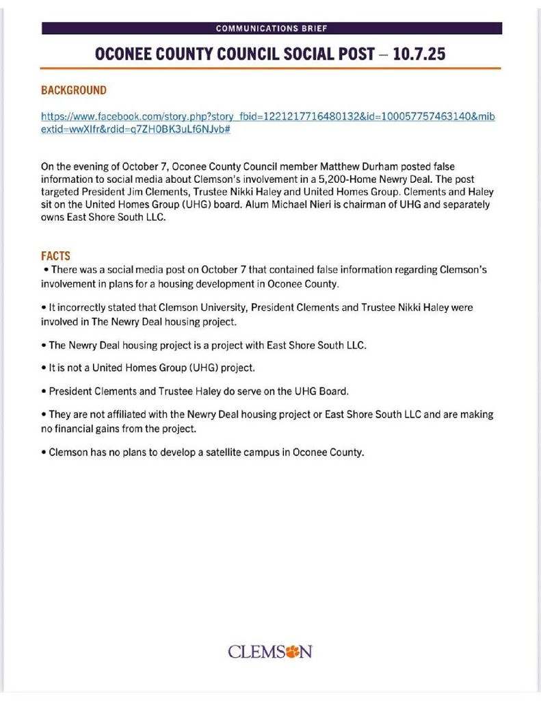 The school issued a communications brief issue last Tuesday (October 7, 2025) following a post from Oconee County Council chairman Matthew Durham – a local official who is leading the charge to block the development (and expose alleged conflicts of interest involving numerous Clemson luminaries).
