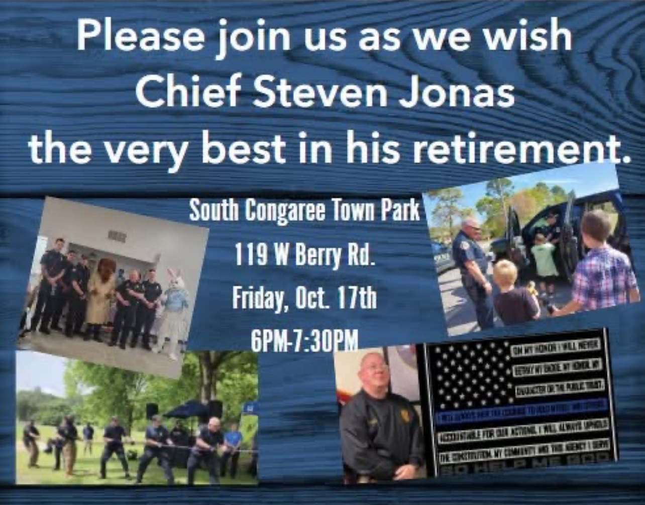 The public is invited to attend Jonas’ retirement party at 6:00 p.m. EDT Friday, October 17, at South Congaree Town Park.
