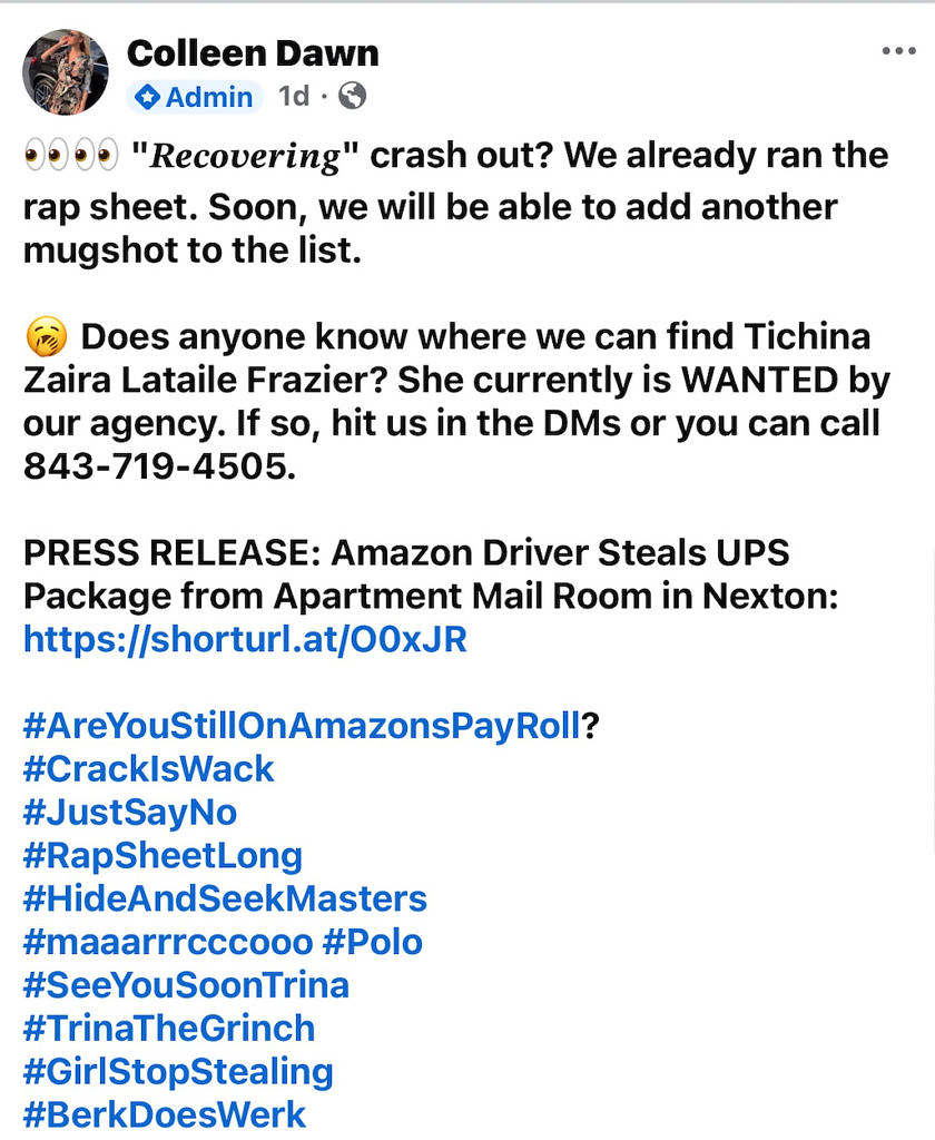 A recent post on the Berkeley County Sheriff’s Department’s (BCSO) Facebook page has stirred up some serious cop drama in the South Carolina Lowcountry. According to the post, the law enforcement agency is seeking information on an Amazon delivery driver spotted on camera allegedly stealing a package after making her deliveries.