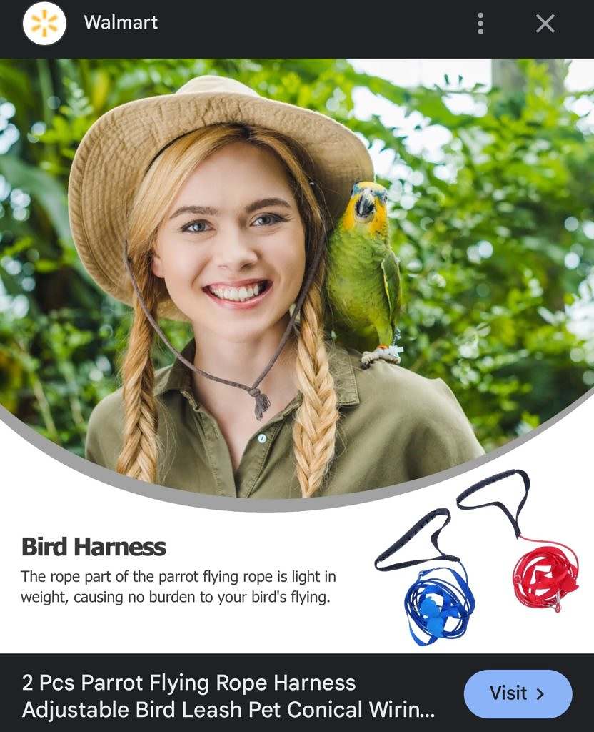 It probably has been fun… in some parallel universe. In this universe, though, Woods is not real – she’s an iStock image bearing the following description: “Happy young woman in safari suit with parrot on shoulder in jungle stock photo.” In addition to appearing on SCDEW’s fake jobs page, she’s also apparently a salesperson for adjustable bird leashes currently on sale at your local Walmart…