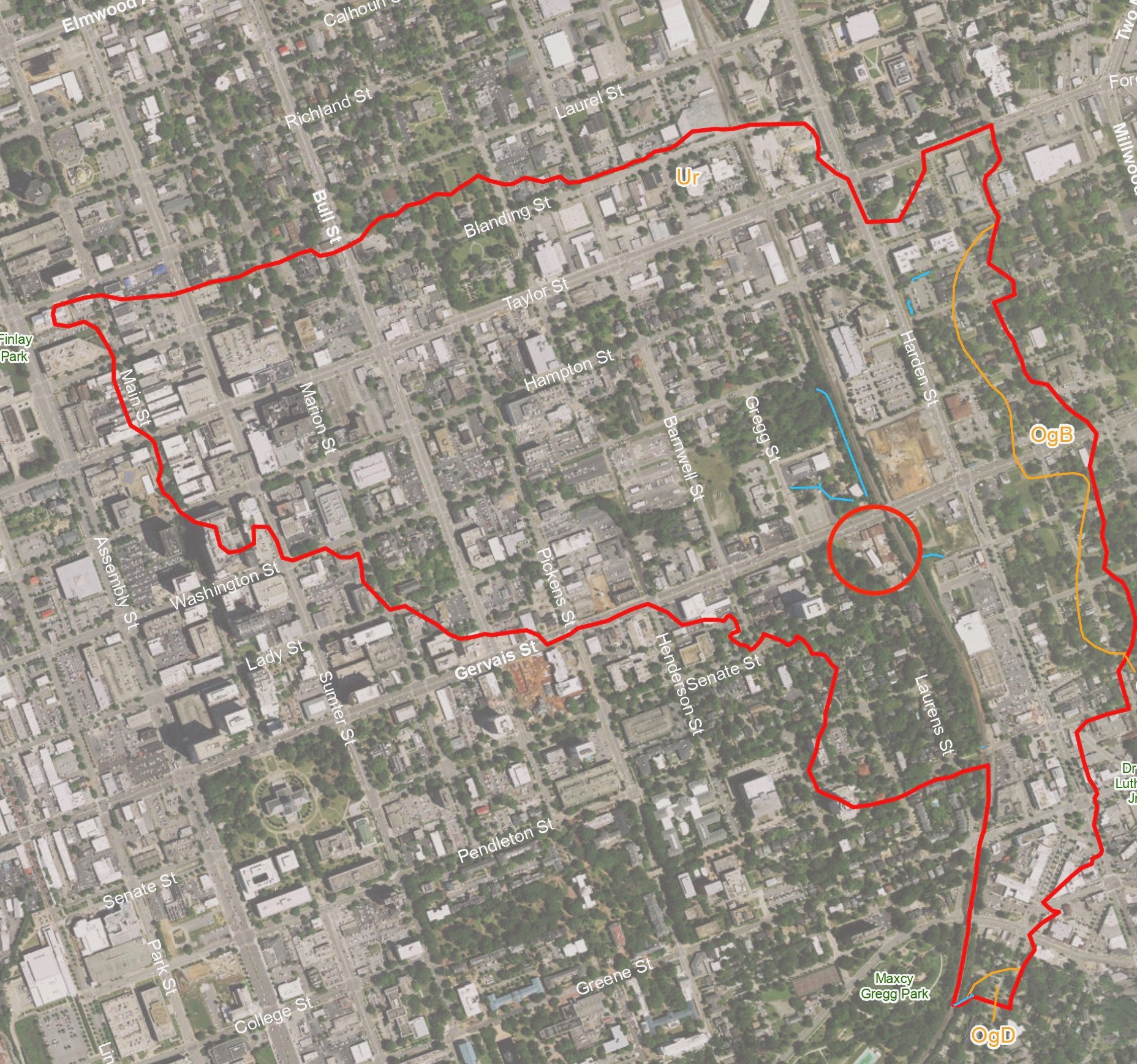 As far as the drainage issues, I worked for Jackson Camera on Harden in the early ’90s where flooding was not an uncommon occurrence. I work at USC now and we have a drill for flooding along Wheat Street. In fact, flooding in the Five Points area has existed since there was a 5 Points (Groucho’s had issues in 1941 when they first opened, The A&P on the corner of Devine an harden had issue sin 1949) The 5 Points is a basin that drain an even bigger area than Will’s crayon work map shows and it gets worse by the day. More development, without a real plan to address the bottle neck that starts at Maxcy Gregg Park and goes all the way down to the Congaree is only going to make it worse. We already have a Class V rapid forming behind the Carolina Natatorium beside the USC Child Development Center. Whaley at Assembly floods so often that permanent gates were installed to block the intersection off as needed (basically any time it rains hard).