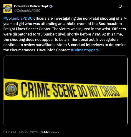 A youth soccer club member sustained a minor injury Sunday evening (June 22, 2025) after being grazed by a stray bullet at the Southeastern Freight Lines Soccer Complex, per statements released by South Carolina United FC (SCUFC) and the Columbia Police Department (CPD).