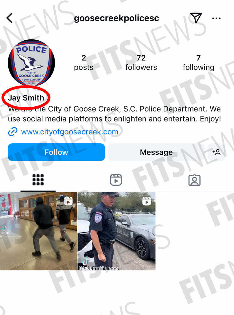 On Instagram, however, a profile that once used the exact same profile photo as the “Jay Smith” Facebook account also appeared under the alias, with the username @goosecreekpolicesc.
