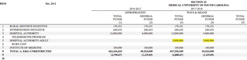According to our sources, this appropriation is especially curious because no one at MUSC requested the money. In fact according to our sources, members of MUSC’s politically appointed board weren’t even aware the appropriation had been included in the ways and means budget.