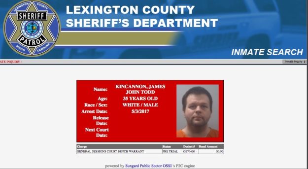 Details of Kincannon’s apprehension remain unclear, but as of Thursday afternoon (May 4) he was being held in the Lexington County, S.C. detention center on a general sessions court bench warrant.
