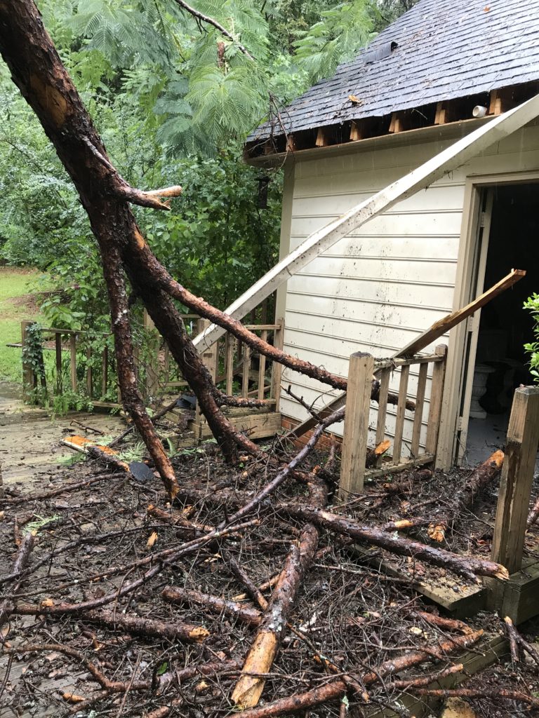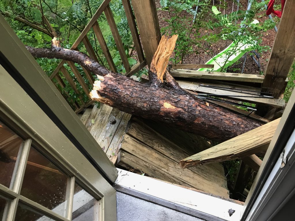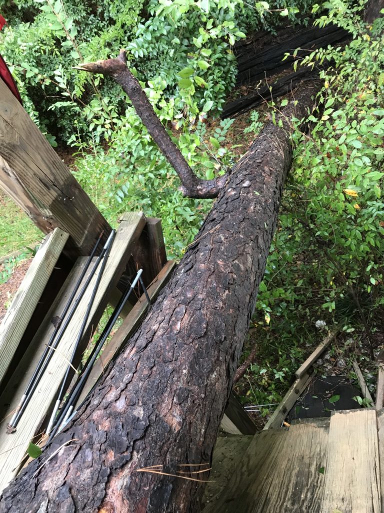 Less than fifteen feet from where I was sitting, the middle trunk of a tall pine tree had slammed into the stairs leading up to my office – taking out the platform and making splinters of the railing.