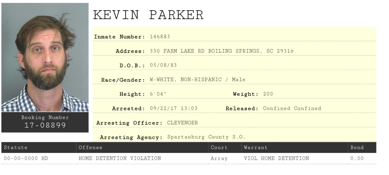 Parker was arrested on Friday by Spartanburg County sheriff’s deputies and charged with violating his home detention. As of this writing, he remains incarcerated at the county’s detention center.