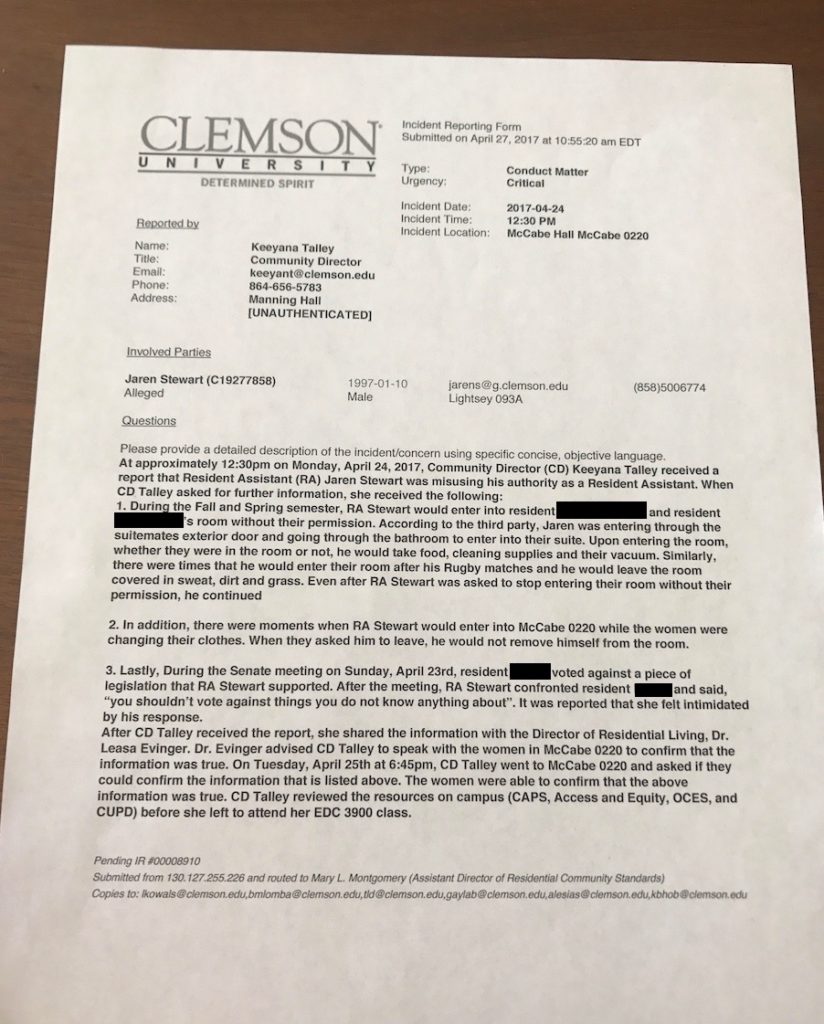 It’s not immediately clear whether Stewart was removed from his role as a resident assistant following these allegations, which were made known to multiple Clemson bureaucrats including the school’s director of residential living (Leasa Evinger), director of housing and dining (Kathy Hobgood) and director of community and ethical standards (Alesia Smith).