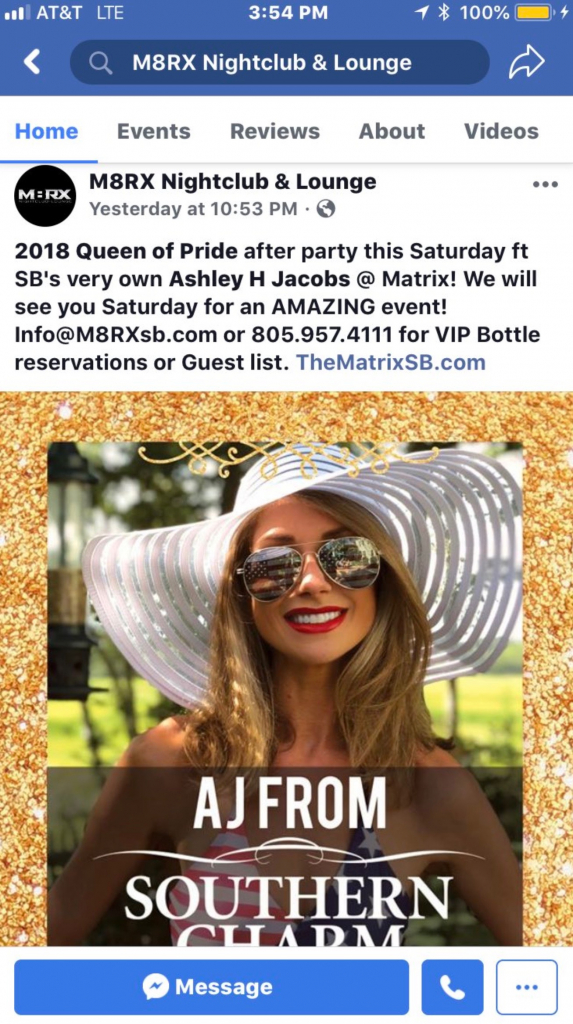 “Southern Charm’s @ashleyhjacobs hosts our Queen of Pride after party this Saturday @ MATRIX! Come party with us! 805.957.4111 or info@m8rxsb.com for VIP bottle service. TheMatrixSb.com”