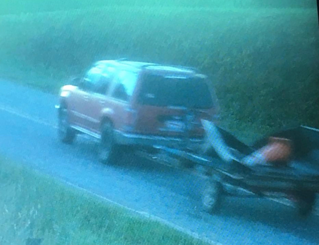 As the images reveal, a masked man in a green T-shirt is seen scaling a fence … with a second image showing a red sport utility vehicle with a trailer leaving the scene.