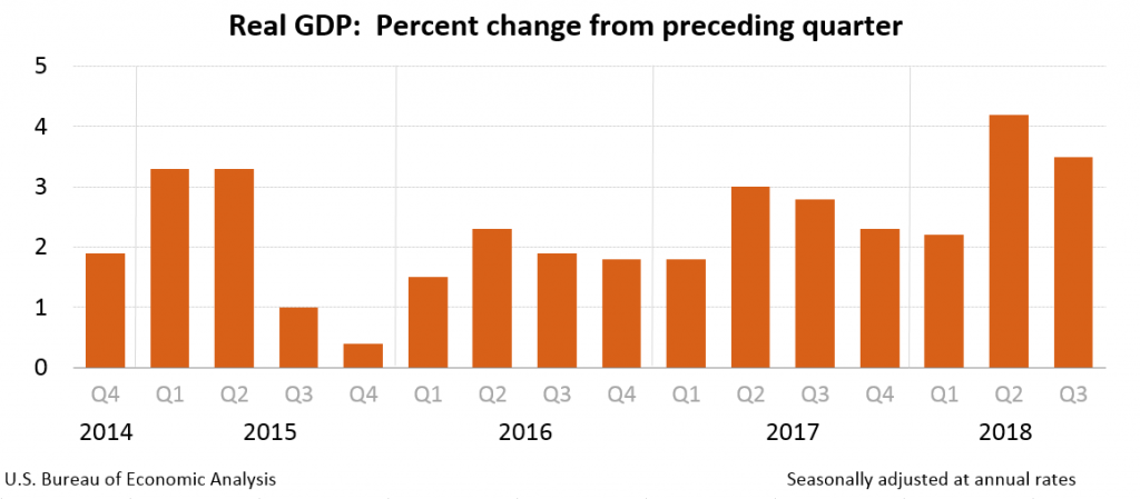 The United States economy grew at a 3.5 percent clip during the third quarter of 2018 according to data released this month by the U.S. Bureau of Economic Analysis (BEA). That’s less than the 4.2 percent growth rate put up during the second quarter, but it was above Wall Street’s expectation of 3.3 percent growth.