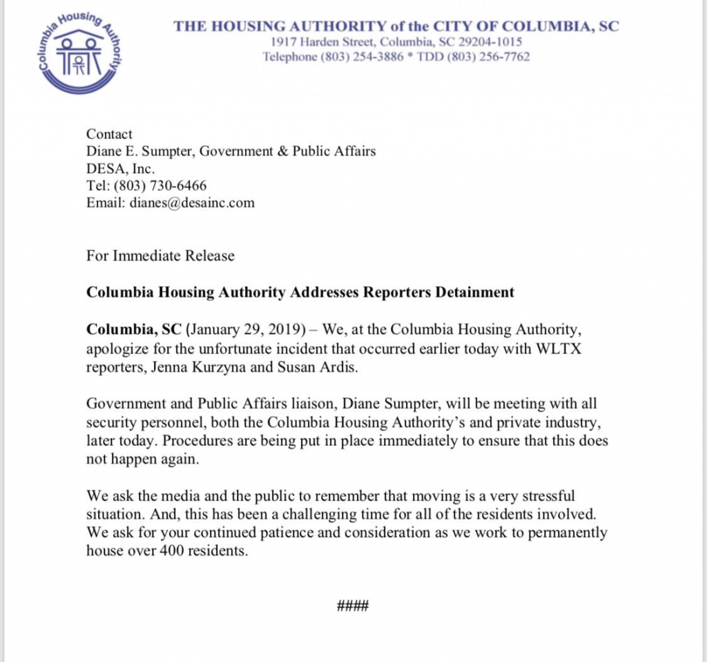 According to WLTX, the two reporters “were arrested Tuesday morning by Columbia Housing Authority police while trying to access the building that houses public documents released by the (CHA) earlier this week for Allen Benedict Court apartments.”
