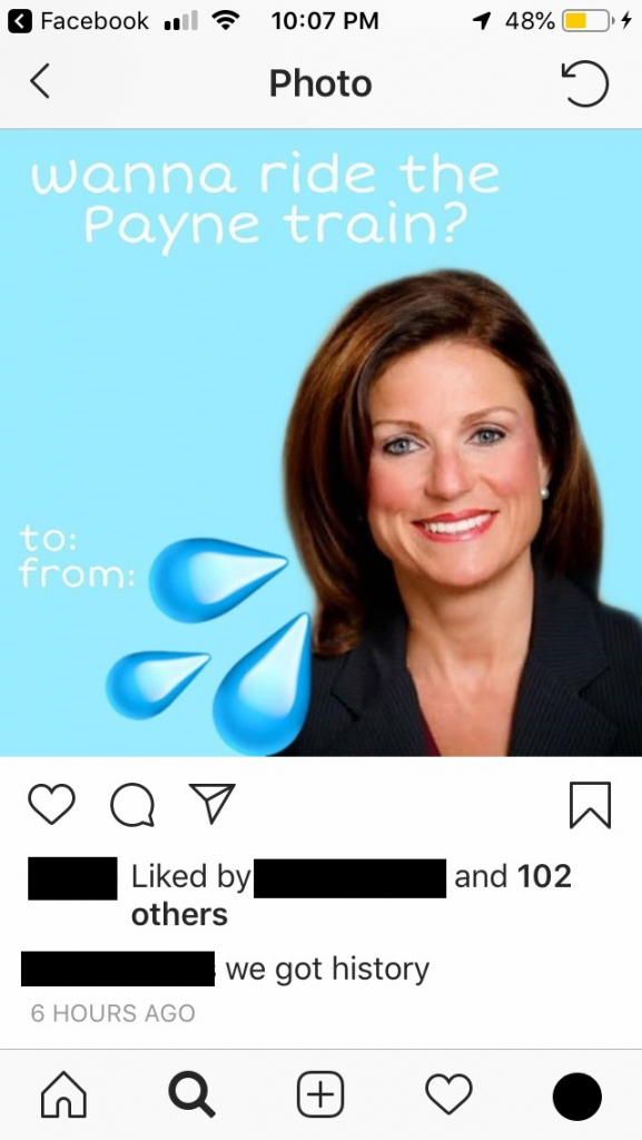 Posted by an anonymous Instagram user, the Valentine’s Day meme features a dated photo of Eckstrom (previously known as Kelly Payne) along with the caption “wanna ride the Payne train?” It also prominently depicts a “sweat droplets” emoji that is often used as a visual representation of the male orgasm.