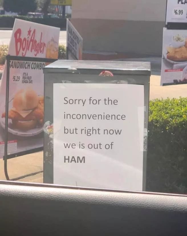 Yes, you read that right: “Sorry for the inconvenience but right now we is out of HAM.”