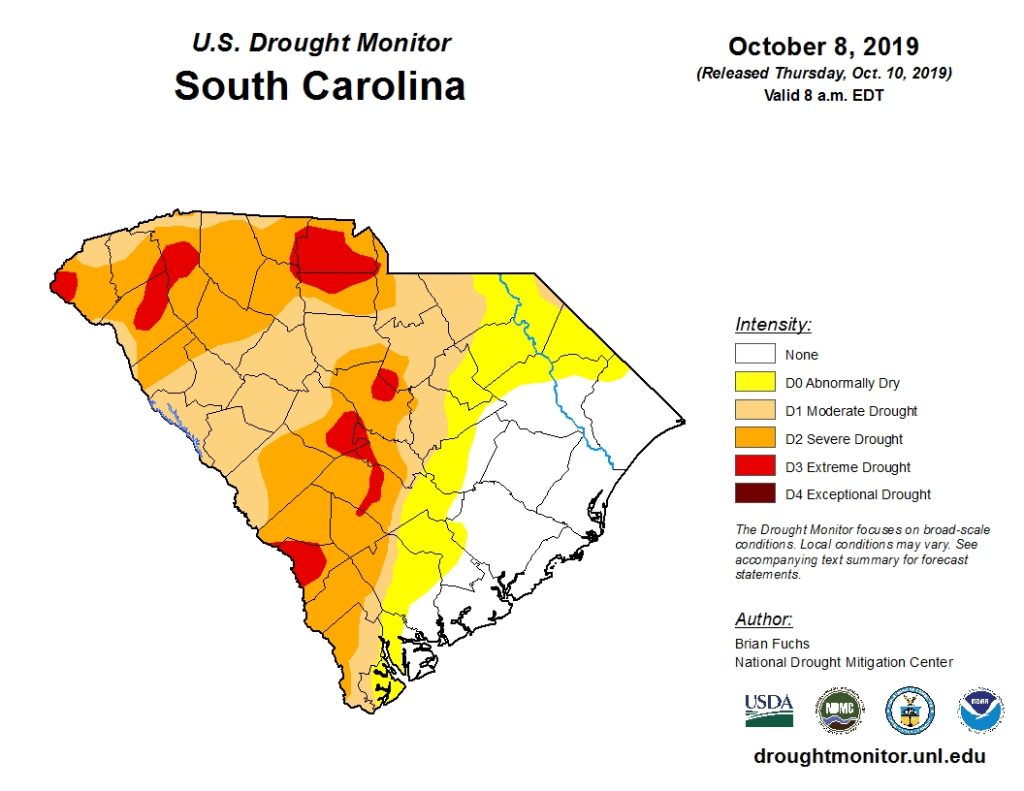 “Farms across many parts of the state are suffering the effects of hot weather and not enough rain,” S.C. agriculture commissioner Hugh Weathers said in a release from his agency. “Slightly lower temperatures this week should provide some relief, but this drought is tough on our South Carolina farmers.”