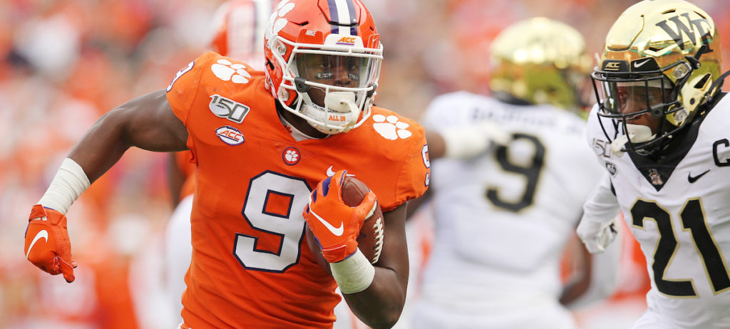 On the ground, returned ACC player of the year Travis Etienne (above) eclipsed the 100-yard mark for the sixth consecutive game – amassing 121 yards on 16 carries with one touchdown. The 5-foot-10, 210-pound Jennings, Louisiana native also caught three passes for 37 yards.