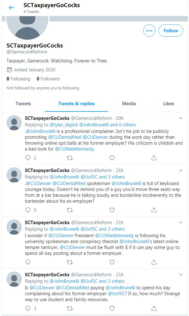 The deleted account – @GamecockReform (a.k.a. “SCTaxpayerGoCocks”) – was authored by a definitive “Twitter troll.” It targeted its personal invective at a particularly vocal critic of University of South Carolina president Robert Caslen, whose hiring and early tenure at the Palmetto State’s flagship institution of higher learning has been marred by multiple controversies.