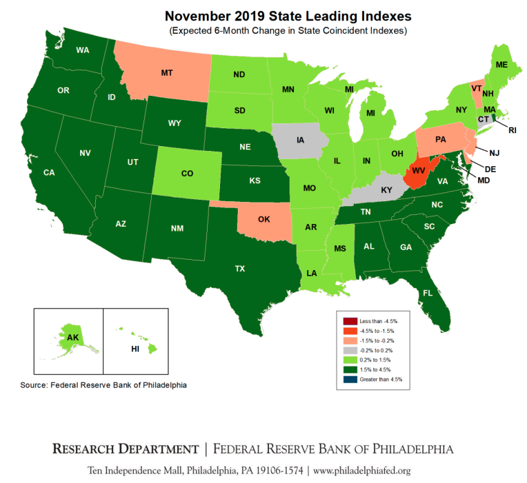Meanwhile nine states – Connecticut, Delaware, Kentucky, Montana, New Jersey, Oklahoma, Pennsylvania, Vermont, West Virginia – posted negative readings. The state in the worst shape? West Virginia – which had a leading index of -2.56 percent.