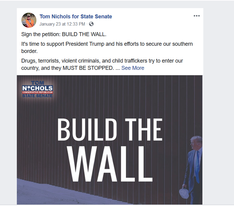 The comment was published on Nichol’s campaign Facebook post about supporting President Donald Trump and the Border Wall.