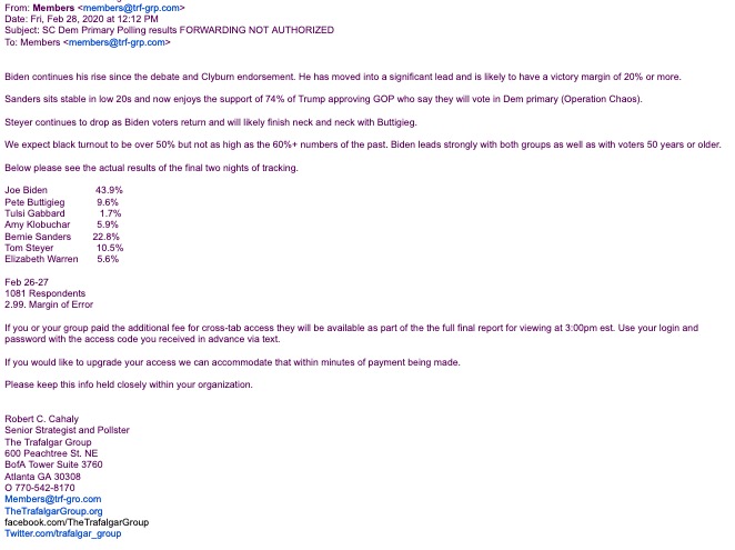 “Biden continues his rise since the debate and Clyburn endorsement,” the email noted, referring to the backing Biden received from House majority whip Jim Clyburn. “He has moved into a significant lead and is likely to have a victory margin of 20 percent or more.”