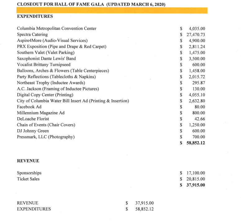 Last year, the district recorded a total net loss of $42,178.10 from the Hall of Fame Induction Gala, as we previously reported.