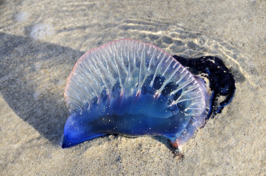 The Portuguese Man-of-War, which actually isn’t a jellyfish but a colony of organisms, can still sting humans after they die. Man-of-war jellies are sack-like creatures with bright blue and purple tentacles. They aren’t extremely common, but are sighted on South Carolina beaches every year.