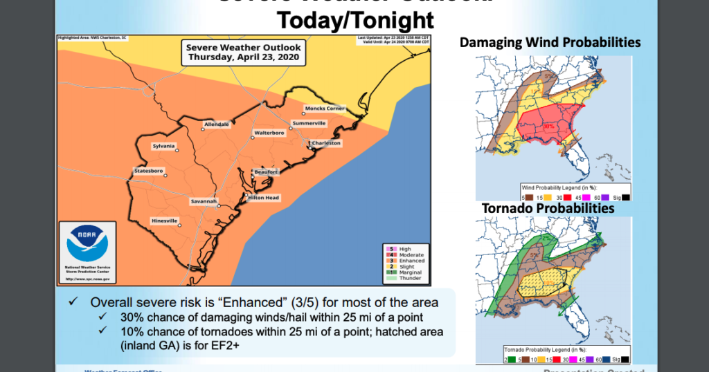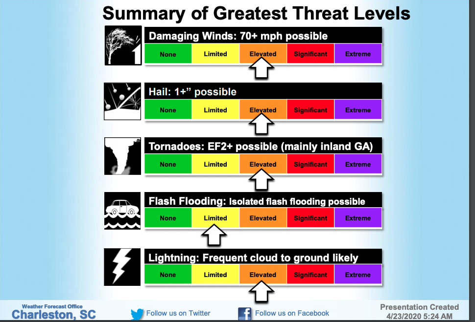 According to the National Weather Service in Charleston, the line of storms in the afternoon are the bigger threat to the Lowcountry compared to the evening storms. Forecasters say those storms could drop large hail and possibly produce a few tornadoes.