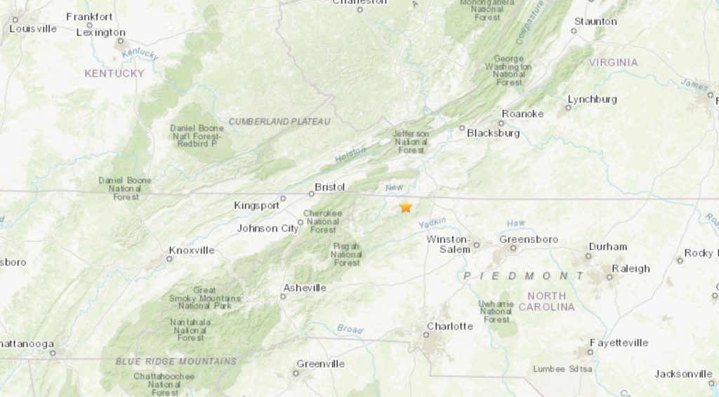 The epicenter of the quake was 2.5 miles southeast of Sparta, North Carolina – at an estimated depth of 2.3 miles below the earth’s surface, according to the U.S. Geological Survey (USGS). That’s just south of the border between North Carolina and Virginia.