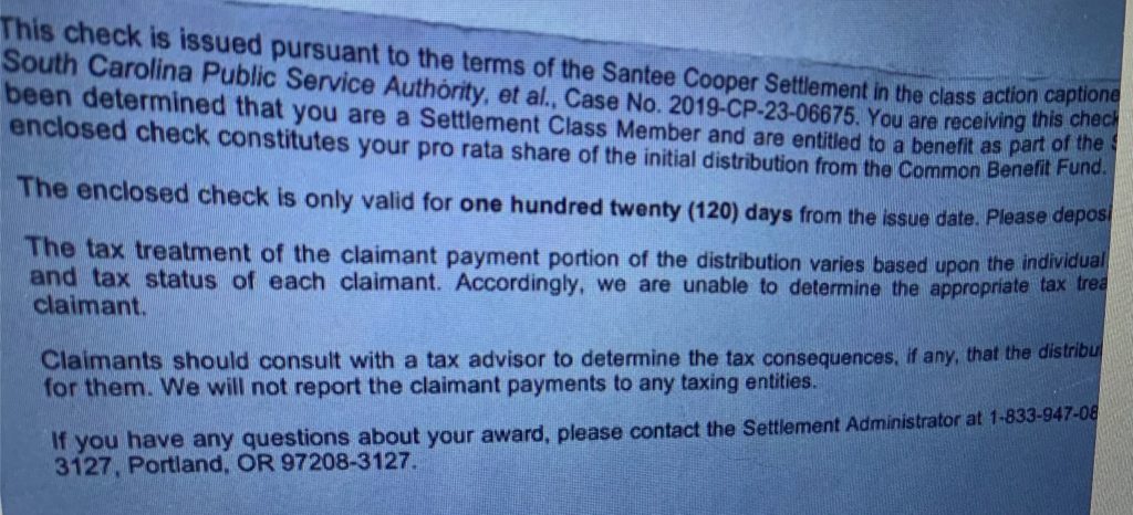 Also, this settlement – which amounts to only around $300 million once the attorney fees and postage costs have been taken out – is being paid in large measure by Santee Cooper itself (meaning the utility is going to have to recoup this money at some point down the road).