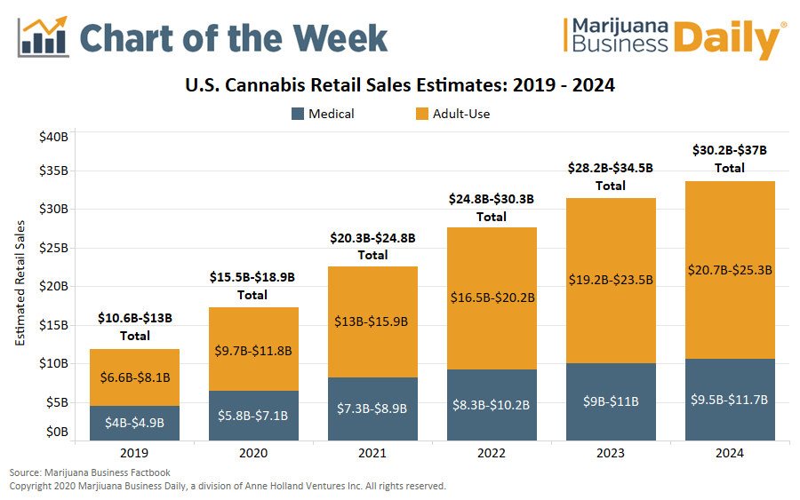 Total sales are expected to climb as high as $37 billion by 2024 – driven by growth in the adult-use segment of the marketplace.