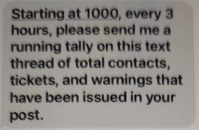 According to our sources, the text message pictured above was sent from an SCHP leader to his subordinates during last fall’s enforcement blitz. Its sender requested updates “every three hours” as to the running total of “contacts, tickets, and warnings that have been issued” by specific commands.