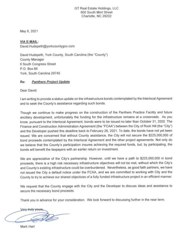 Last Thursday (May 6, 2021), an especially blunt letter was sent by Mark Hart of GT Real Estate Holdings – an entity affiliated with the Panthers – to York county manager David Hudspeth. In that letter, Hart laid bare the struggles Rock Hill is experiencing when it comes to issuing the promised bonds for the Panthers’ development – which includes a government-subsidized practice facility for the team and corporate offices for its executives.