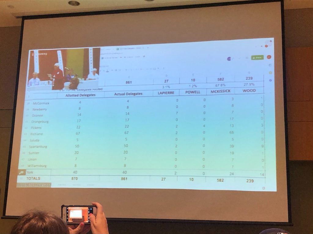 Buoyed by not one, not two, but three endorsements from former U.S. president Donald Trump, McKissick appears to have captured 582 delegates (67.8 percent) compared to Wood’s 239 delegates (27.9 percent). “Spoiler” candidate Michael LaPierre received 27 delegates, while Mark Powell received 10 delegates.