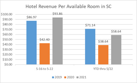 According to the latest data from the S.C. Department of Parks Recreation and Tourism (SCPRT), revenue per available room – or “RevPAR,” a key industry metric – clocked in at $93.86 for the week ending May 22, 2021. That number marked a 121.3 percent increase from the equivalent week in 2020, when societal shutdowns tied to Covid-19 were still ravaging the nation’s economy.