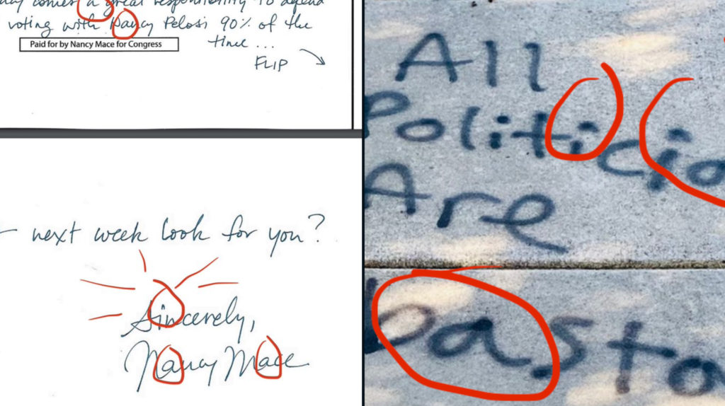 In fact, several amateur forensic experts took to social media to expose alleged similarities between the vandals’ spray paint script and Mace’s own handwriting …