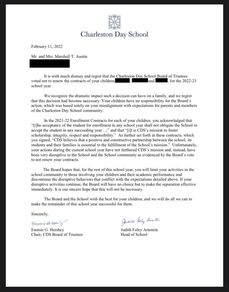 “We recognize the dramatic impact such a decision can have on a family, and we regret that this decision has become necessary,” the letter noted. “Your children have no responsibility for the board’s action, which was based solely on your misalignment with expectations for parents and members of the Charleston Day School community.”