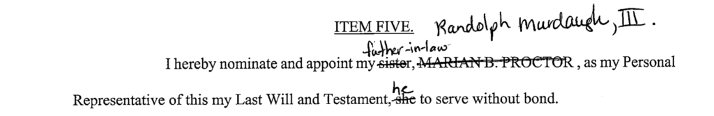 John Marvin Murdaugh, Maggie Murdaugh’s brother-in-law, was made personal representative of the estate last year. This was after apparently Maggie’s sister’s name was scratched off as personal representative and someone wrote Randolph Murdaugh III’s name in the 2005 will (see a screenshot below).