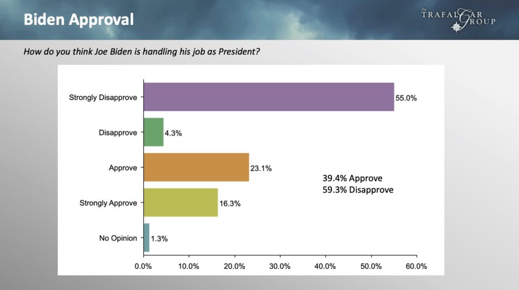 Within those numbers were some interesting intensity indicators, though. Among the 59.3 percent who disapproved of Biden’s performance, 55 percent said they “strongly” disapproved. Conversely, of the 39.4 percent who approved of Biden’s performance – less than half of them – 16.3 percent indicated strong approval.