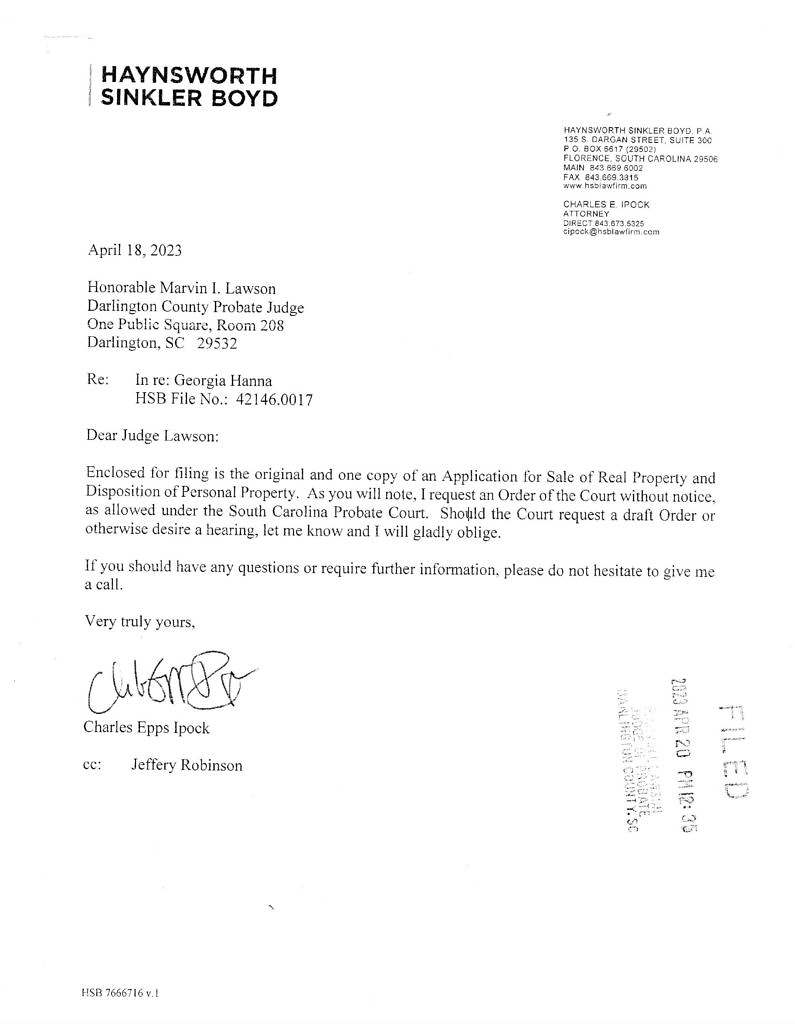 Attached to Player’s motion was a letter from Charles Ipock – an attorney with the Haynesworth Sinkler Boyd law firm – requesting judge Lawson’s order be issued “without notice, as allowed under the South Carolina Probate Court.”