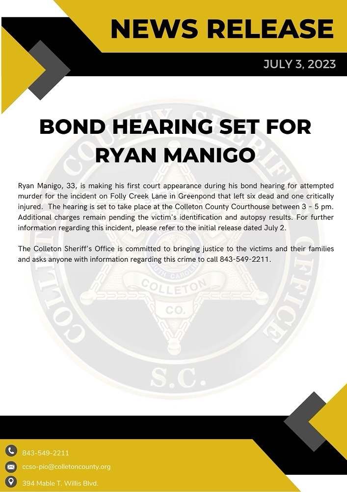 Ryan Lenard Manigo, 33, is scheduled to be arraigned on one count of attempted murder sometime between 3:00 – 5:00 p.m. EDT this afternoon (Monday, July 3, 2023) in Walterboro. Colleton County magistrate Roosevelt L. Jenkins is scheduled to preside over his bond hearing.