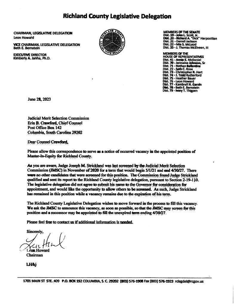 Specifically, Howard submitted a letter to Erin Crawford, the chief legal counsel for the S.C. Judicial Merit Selection Commission (SCJMSC), on June 29, 2023 stating there was an “occurred vacancy” in Strickland’s post because the delegation “did not agree to submit his name to the governor for consideration.”