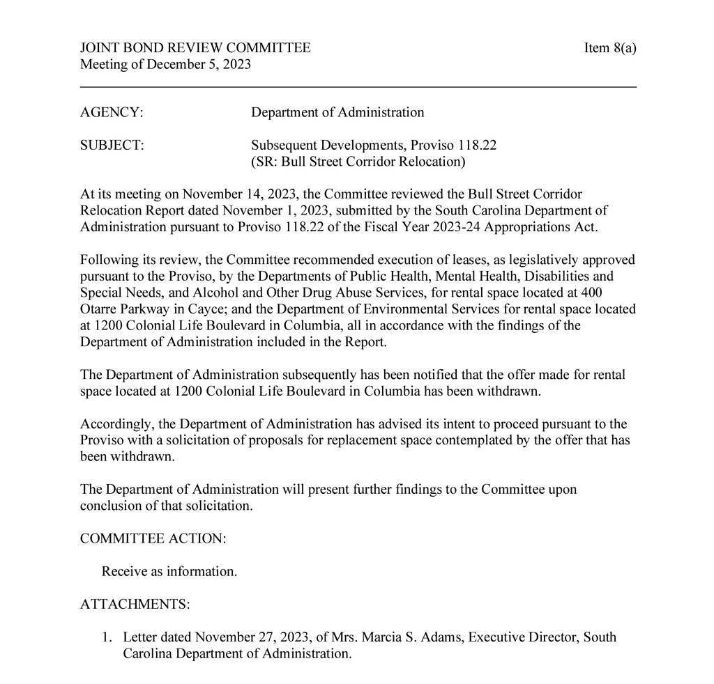Anyway, lawmakers controversially mandated in the current budget that “one or all the state agencies or their successor agencies currently located on Bull Street in the City of Columbia” must be relocated in time for the agency reshuffle on July 1, 2024.