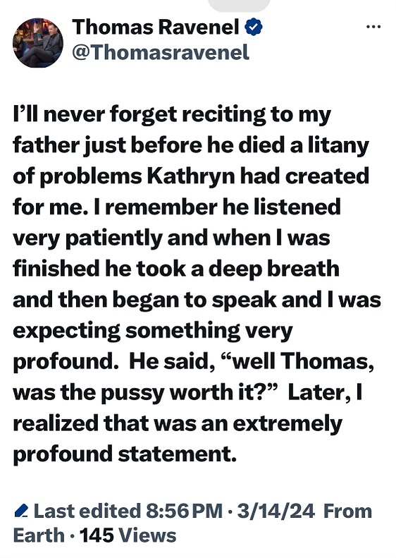 Ravenel pinned this message to his account on X, but – like the message recalling his conversation with his late father – he deleted it upon announcing the death of his brother on Friday morning.