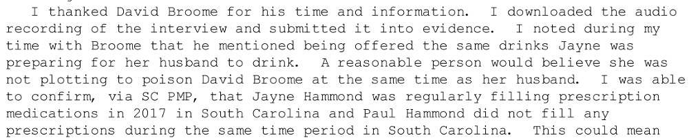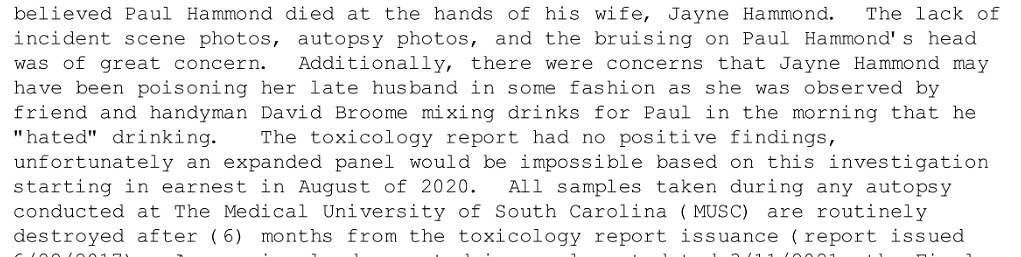 Jayne brought this up again during her February 2024 interview with BCSO. According to Reynells’ notes on the interview, Jayne “stated her husband’s body was sent to MUSC for a full autopsy and tox screen. Hammond advised there was no foul play indicated and the only thing of note was a pinkish fluid in her husband’s stomach which she advised was later determined to be Tums antacids.”