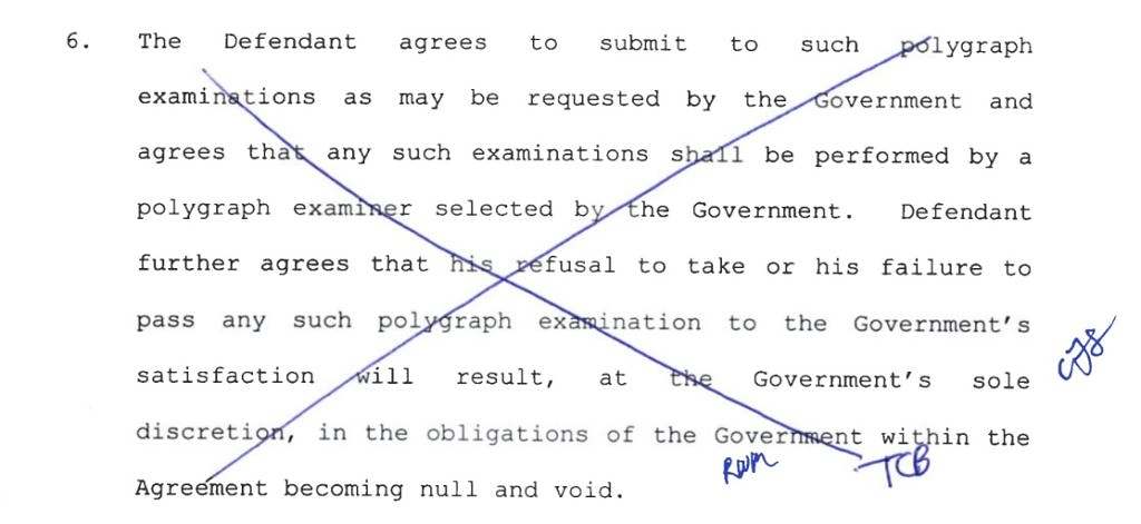 Interestingly, Miller’s federal plea agreement originally included a polygraph provision – similar to the one contained in the federal plea agreement signed by Alex Murdaugh. As part of that provision, he agreed to submit to a lie detector test when requested by the government.