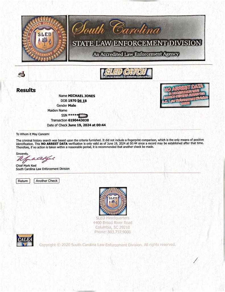 Jones has since provided FITSNews with an S.C. Law Enforcement Division (SLED) CATCH report dated June 19, 2024. According to the report, the central repository for all criminal records in-state has “no arrest data” for the District 35 frontrunner.