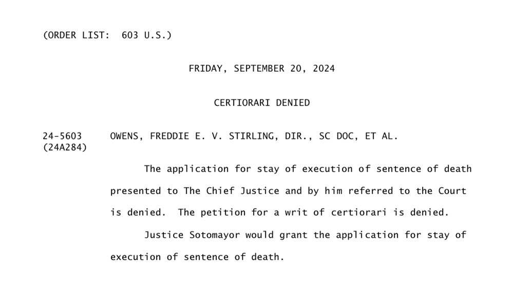 The sentence – upheld by state and federal courts – was carried out by the S.C. Department of Corrections (SCDC) after a last-minute appeal from Owens’ attorneys was belatedly denied by the U.S. supreme court shortly after 6:44 p.m. EDT. Only one of the nine justices – Sonia Sotomayor – stated she would have granted Owens’ application for a stay of his death sentence.