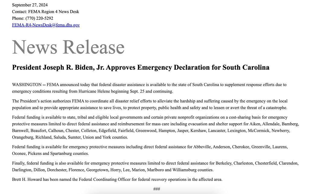 2:43 p.m. EDT – U.S. president Joe Biden (or whoever holds his auto-pen) has approved South Carolina’s emergency disaster declaration, authorizing the Palmetto State to receive “federal disaster assistance” related to the ravages of Hurricane Helene and authorizing the Federal Emergency Management Agency (FEMA) to “coordinate all disaster relief efforts.”