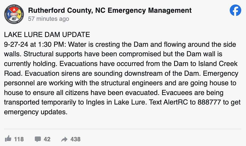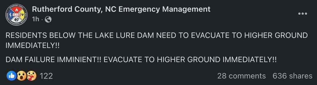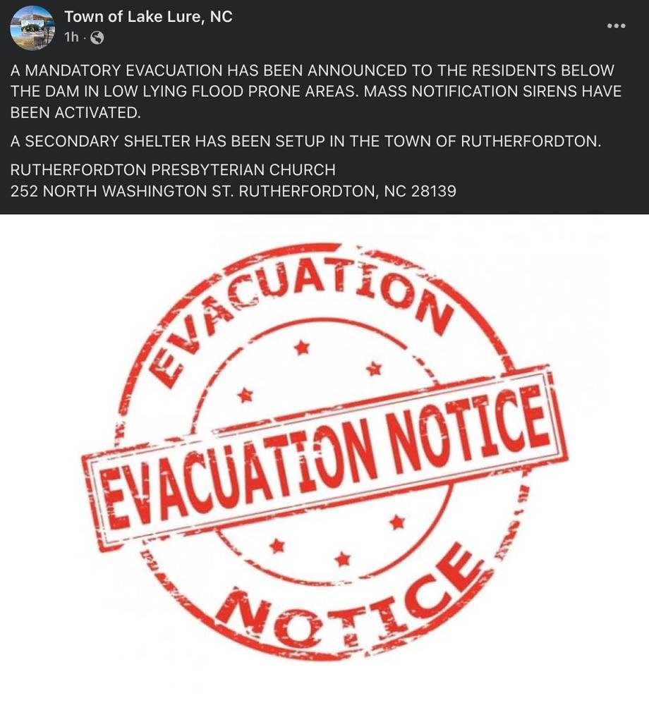 12:25 p.m. EDT – An update on the “imminent failure” of the Lake Lure Dam… according to the town, “mass notification sirens have been activated.” Hard to see it getting more serious than that!