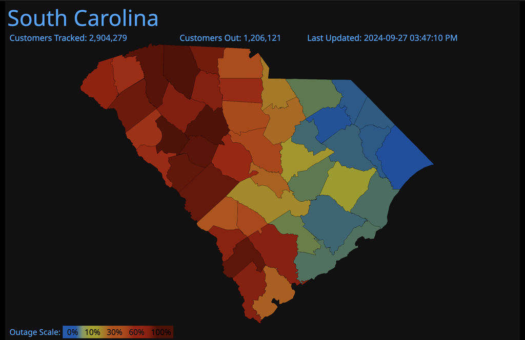 4:53 p.m. EDT – The latest numbers on power outages in South Carolina. The number has decreased a little since this morning when it stood at 1,383,026, but power outages are still widespread through the western parts of the state.